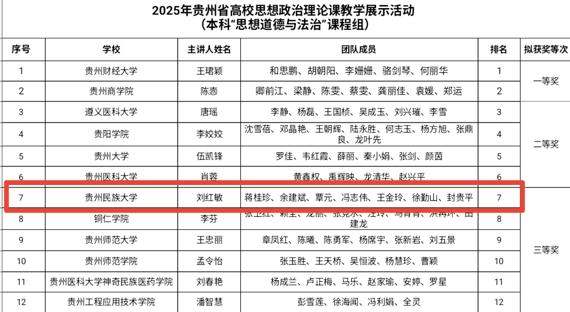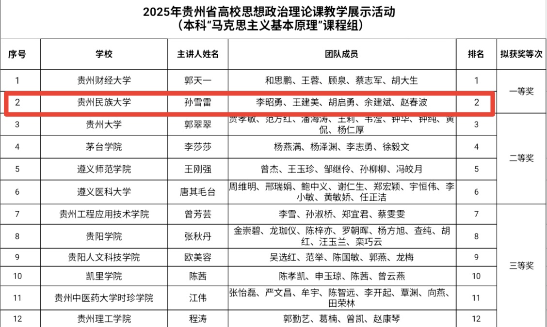 近期,在第四届全国高校思想政治理论课教学展示活动贵州省初赛中,马克思主义学院参赛教师再创佳绩,7名参赛教师满额参赛、全部获奖,创省赛历史最好成绩,其中一等奖2项(刘敏老师领衔的本科“习近平新时代中国特色社会主义思想概论”课程组、孙雪雷老师领衔的本科“马克思主义基本原理”课程组),二等获2项(许文英老师领衔的本科“毛泽东思想和中国特色社会主义理论体系概论”课程组、杨荣华老师领衔的研究生思政课课程组),三等奖3项(刘红敏老师领衔的本科“思想道德与法治”课程组、何丽芝老师领衔的本科“中国近现代史纲要”课程组、肖军老师领衔的本科“形势与政策”课程组)。同时,刘敏课程组和孙雪雷课程组获国赛参赛资格。