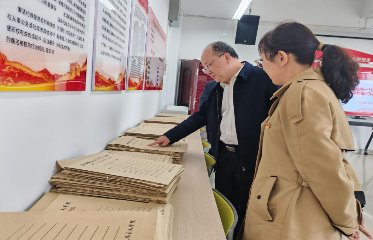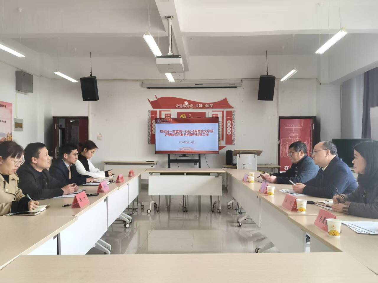 2026年3月13日下午,校长吴一文教授、教务处处长马飞、教学督导宋强、评估中心马晨曦老师深入马克思主义学院开展专项督导检查教学档案归档工作。此次检查重点聚焦无纸化考试的过程性材料的归档进展,旨在进一步推进教学管理规范化,确保评估材料完备有序。学院领导班子成员及教务科负责人参与检查工作。