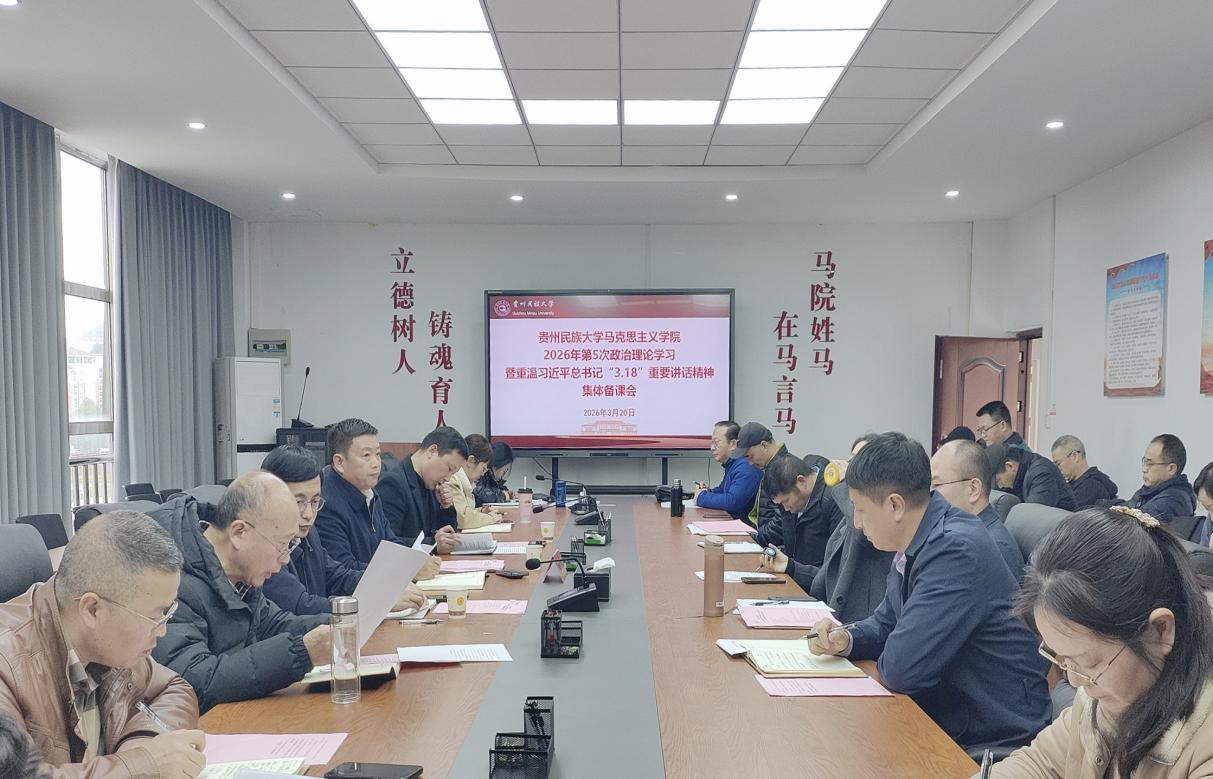 2026年3月20日下午,贵州民族大学马克思主义学院在北校区7号楼529会议室召开2026年第5次政治理论学习暨重温习近平总书记“3·18”重要讲话精神集体备课会。本次会议由学院党委书记徐勤山同志主持,校党委常委、副校长董强教授出席会议,学院全体专兼职思政课教师参加会议。