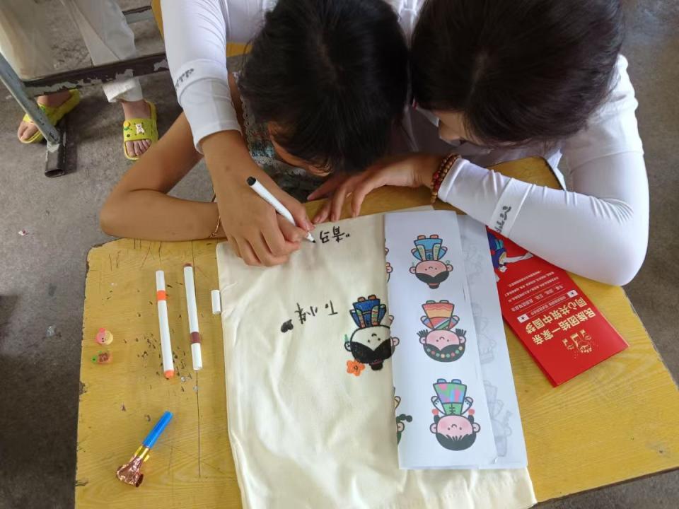 期间,实践队还到松柏小学,开展“同心讲堂”和“侗绣画坊”活动。“同心讲堂”讲述了“弄染结盟”的红色故事,让孩子们感悟军民情谊;“侗绣画坊”中,队员带领孩子们在帆布包上绘制侗绣图案和民族服饰卡通形象,感受侗族文化魅力。
