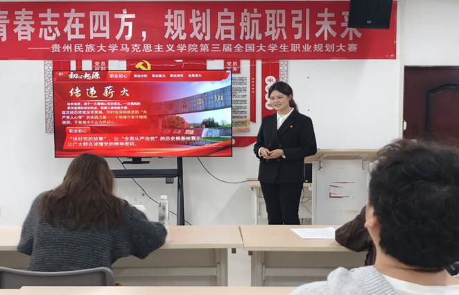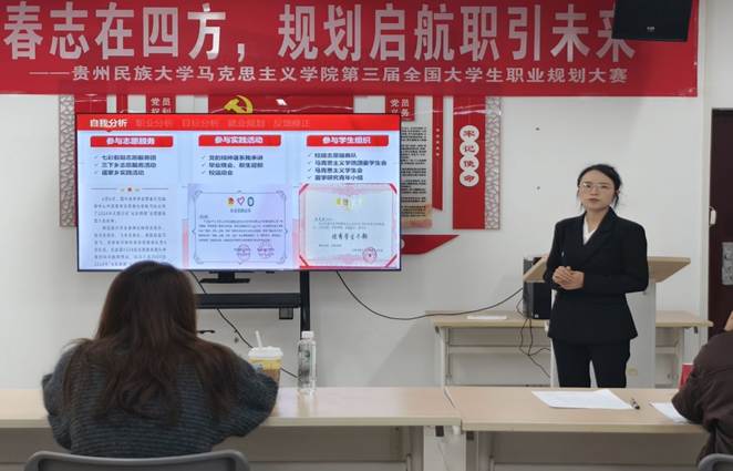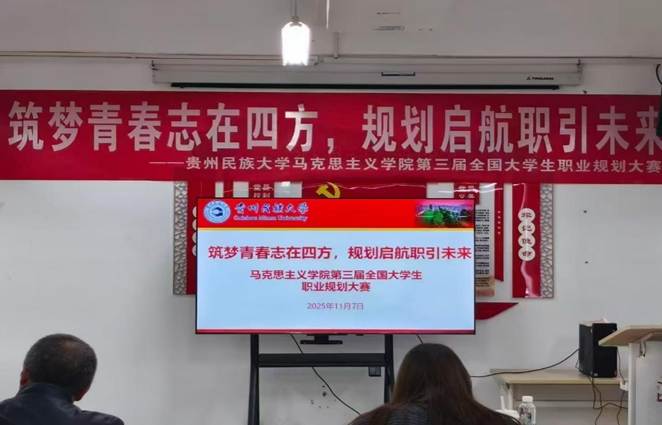 为传播和普及职业规划理念,帮助大学生科学合理地规划大学学习与生活,马克思主义学院于2025年11月7日下午在北校区7号楼530会议室举办“筑梦青春志在四方,规划启航职引未来”——马克思主义学院第三届全国大学生职业规划大赛选拔赛。本次比赛由贵州省普通高等学校毕业生就业工作办公室李佳佳老师,学院党委委员、系主任余建斌老师,学院马克思主义基本原理教研室主任孙雪雷老师担任评委。